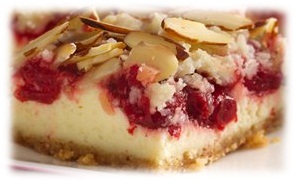 Luscious juicy sweet cherries swimming on top of our rich, creamy, velvety cheesecake resting on cookie almond crust topped with our delicious almond streusel.