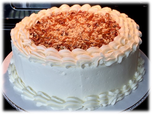 Our luscious Banana Crunch Cake is moist and flavorful with the sweetness of mashed ripe bananas and is a Heavenly Handmade Homemade cake made with a lot of love in it! Decorated with our cream cheese icing and topped with toffee, walnuts and caramel.