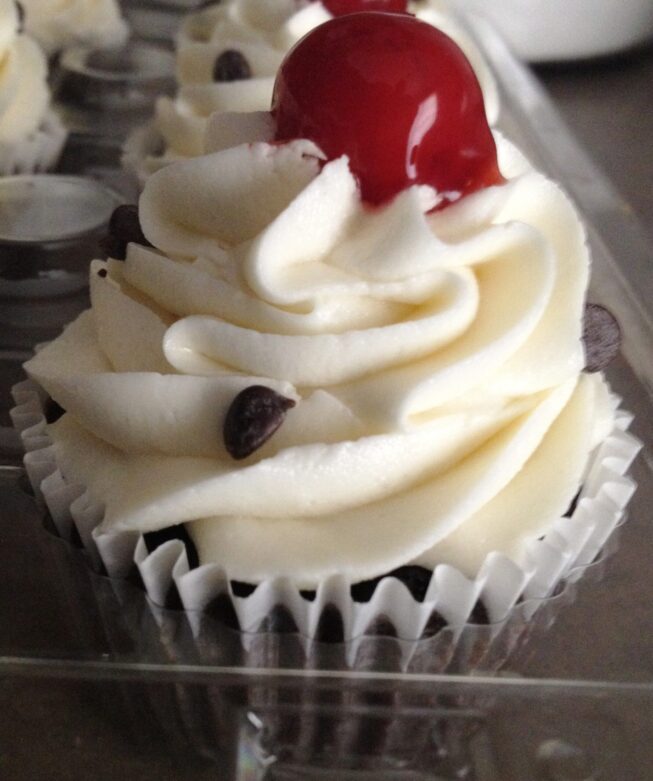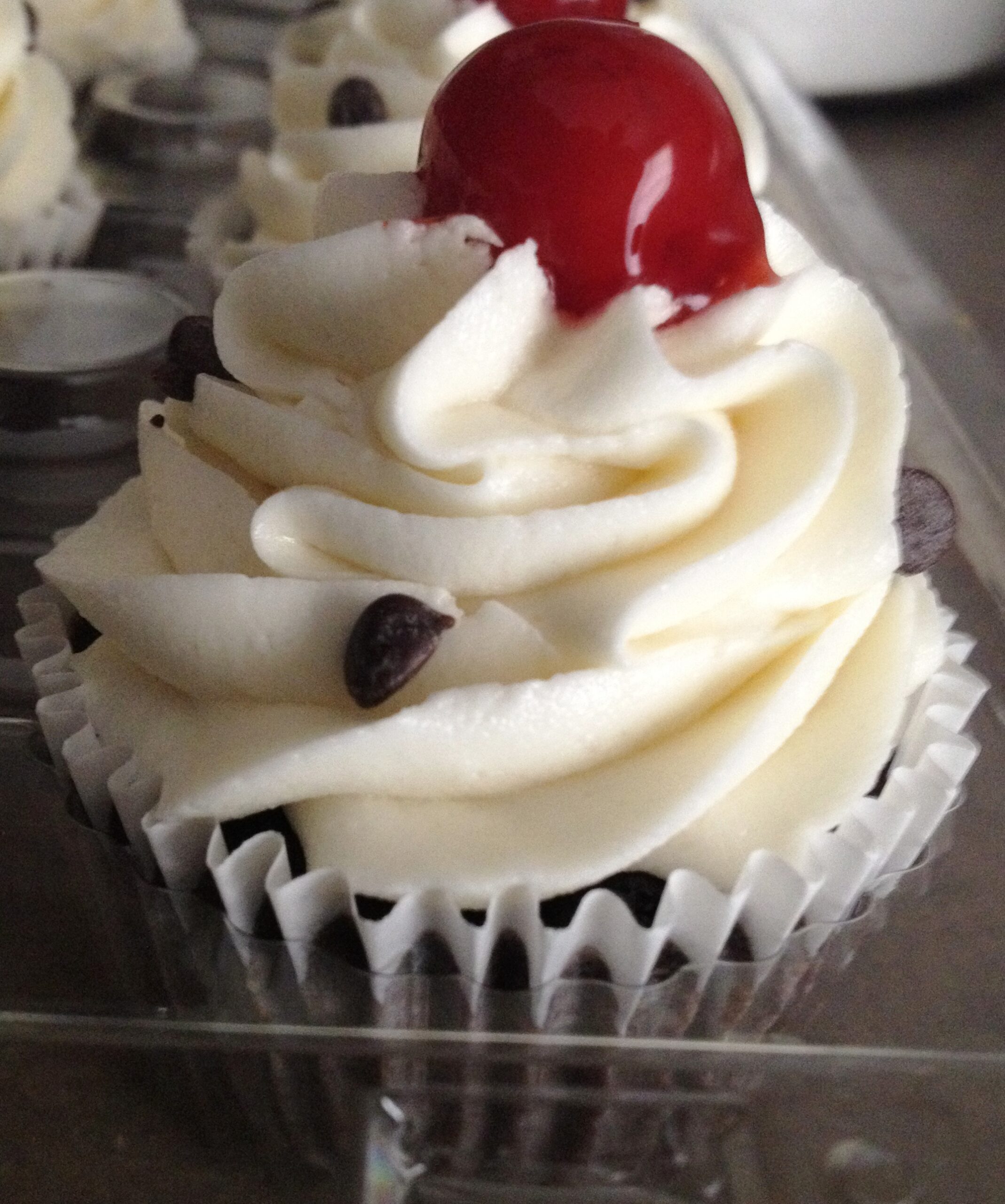Our Rich Decadent moist chocolate cupcakes are filled with cherries and topped smooth rich cream cheese icing and sprinkled with mini chocolate chips.
