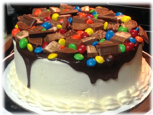 Our Candy Explosion Cake was inspired by my sister Shantell. This cake is loved by many and pared with a tall glass of Cold Milk! We take our rich moist chocolate layer cake and cover it with butter cream icing. We top it with all sorts of candy pieces nestled on top of a bed of rich milk chocolate ganache.