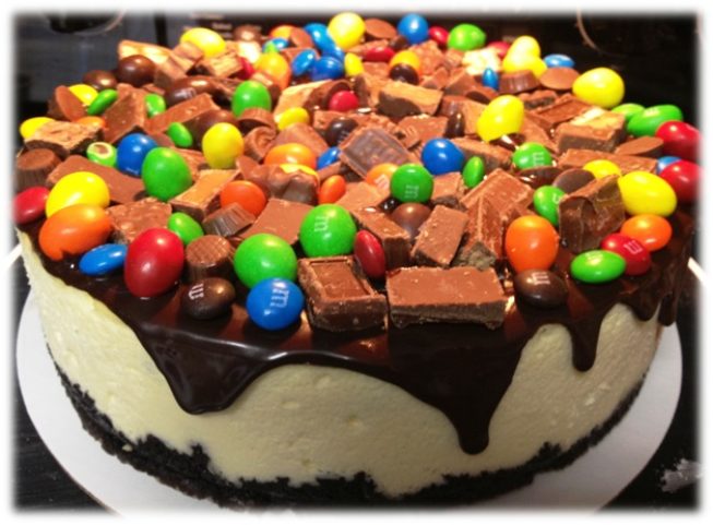 Our Velvety Candy Explosion Cheesecake is light, fluffy, and rich swimming with candy bar pieces and a homemade chocolate cookie crust. It is topped with candy pieces, and drizzled with rich delicious milk chocolate. It’s a velvety delight you’ll personally love.