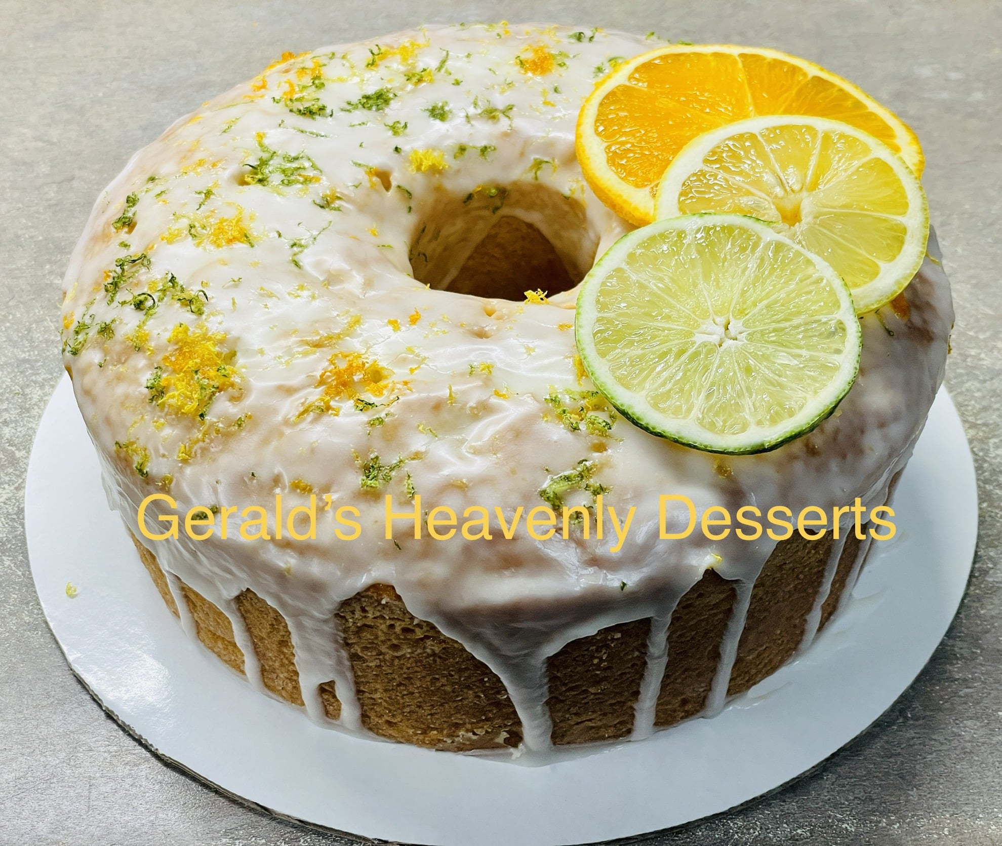 Our moist citrus pound cake is made with fresh lemons, limes, orange, butter, fresh jumbo eggs, flour, sugar & real vanilla.