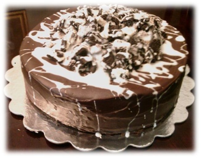 Perfectly baked, perfectly textured, and perfectly presented. It comes to you light, fluffy, chocolate and rich with chocolate cookie chunks and a chocolate cookie crust. It is dipped in a rich chocolate ganache and topped with a delicious white glaze drizzled over chocolate cookie pieces