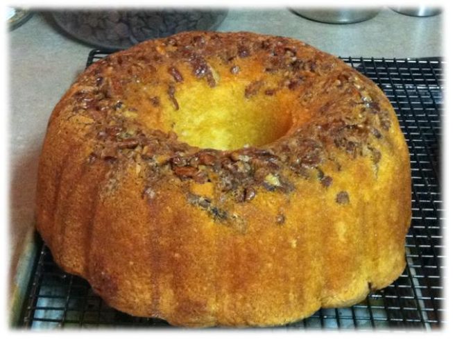 Our buttery pound cake baked with rum in it then more hot buttered rum and pecans are poured over the top