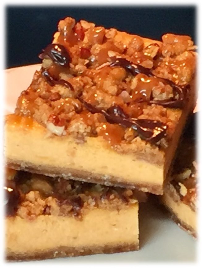 Our delicious, rich, velvety, cheesecake combined with Georgia sweet potatoes and spices sitting on top of a pecan cookie crust glazed with our caramel pecan streusel topping.