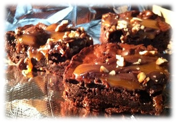 Made from scratch moist, rich, decadent brownies. Semi sweet Chocolate, rich creamy caramel sauce are drizzled on top of the brownies and sprinkled with Georgia pecans.