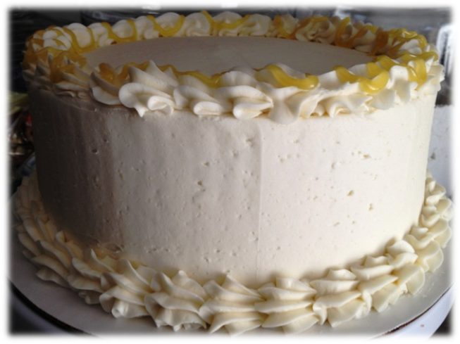 White chocolate is added to our moist white cake layer with lemon curd nestled between the layers and covered with white chocolate butter cream icing