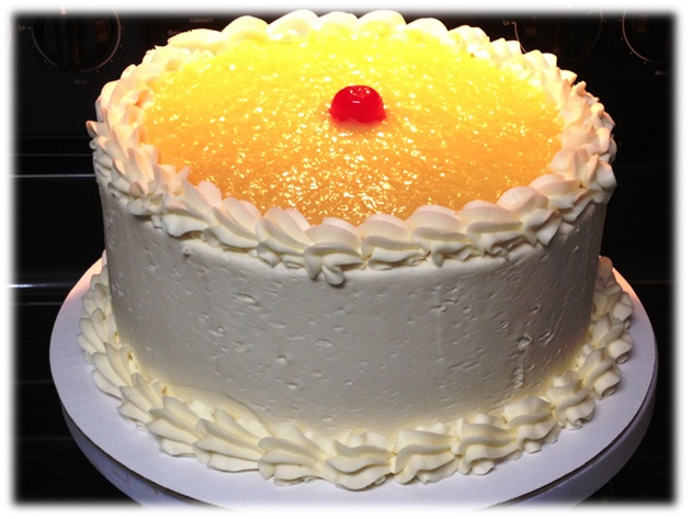Moist White Chocolate cake with pineapple between each layer resting on a glaze. The cake is covered with white chocolate butter cream frosting and beautifully decorated with pineapple and topped off with a cherry.